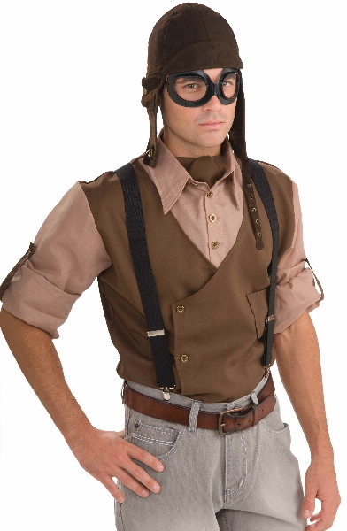 This is an American World War I style Steampunk Aviator Set from Forum Novelties. This Steampunk Aviator Set includes a 19th century style aviator hat and goggles. The retro aviator helmet features a dark brown distressed look with stitching to lend to its vintage style and matching piping. It secures around the neck with an adjustable buckle and grommets. The aviator goggles feature a flexible black plastic frame and an elastic strap to secure it to the head. The goggles do not have lenses as they are meant as a costume prop. One size fits most. They are slightly lower quality than other similar items we are selling which is why the price is lower. These are new and unused items that have been stored in a smoke and pet free environment.