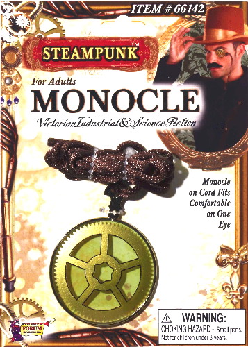 This is a Victorian style monocle eyepiece with a gold toned gear eyepiece and cord, perfect for costuming, especially for the popular steampunk genre. It is a new, unused monocle and fits most adults. This item has been stored in a smoke and pet free environment.