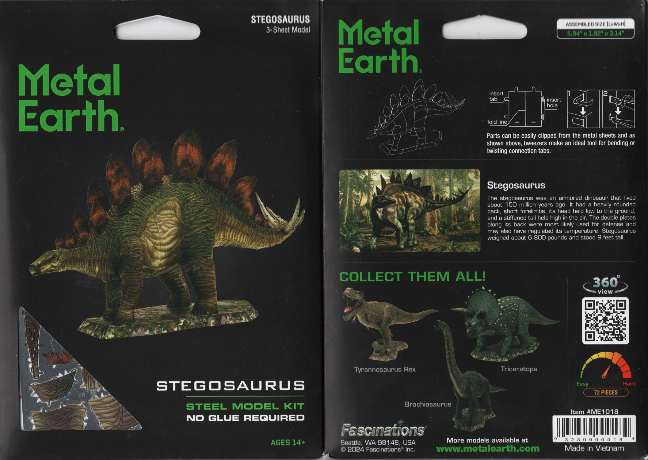 This amazingly detailed model starts as three 4″ square sheets and finishes as a 3-D model. It measures 5.94″ L x 1.92″ W x 3.14″ H when assembled and this one features a Stegosaurus dinosaur. The stegosaurus was an armored dinosaur that lived about 150 million years ago. It had a heavily rounded back, short forelimbs, its head held low to the ground, and a stiffened tail held high in the air. The double plates along its back were most likely used for defense and may also have regulated its temperature. Stegosaurus weighed about 6,800 pounds and stood 9 feet tall. The sheets contain detailed laser etching for easy removal. Complete instructions are included to show you how to pop out the pieces, bend the tabs, and connect them at the attachment points with an average assembly time of 60-75 minutes and is considered challenging difficulty. It has been stored in a smoke and pet free environment. We also offer an optional LED base (blue or white lights) or a Solar Powered Spinner for better display of your model.