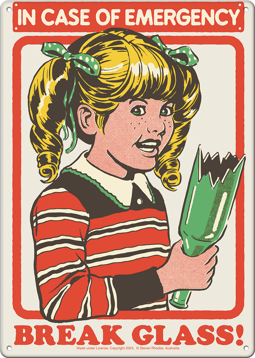 Steven Rhodes Warped Humor In Case of Emergency BREAK GLASS Metal Sign UNUSED