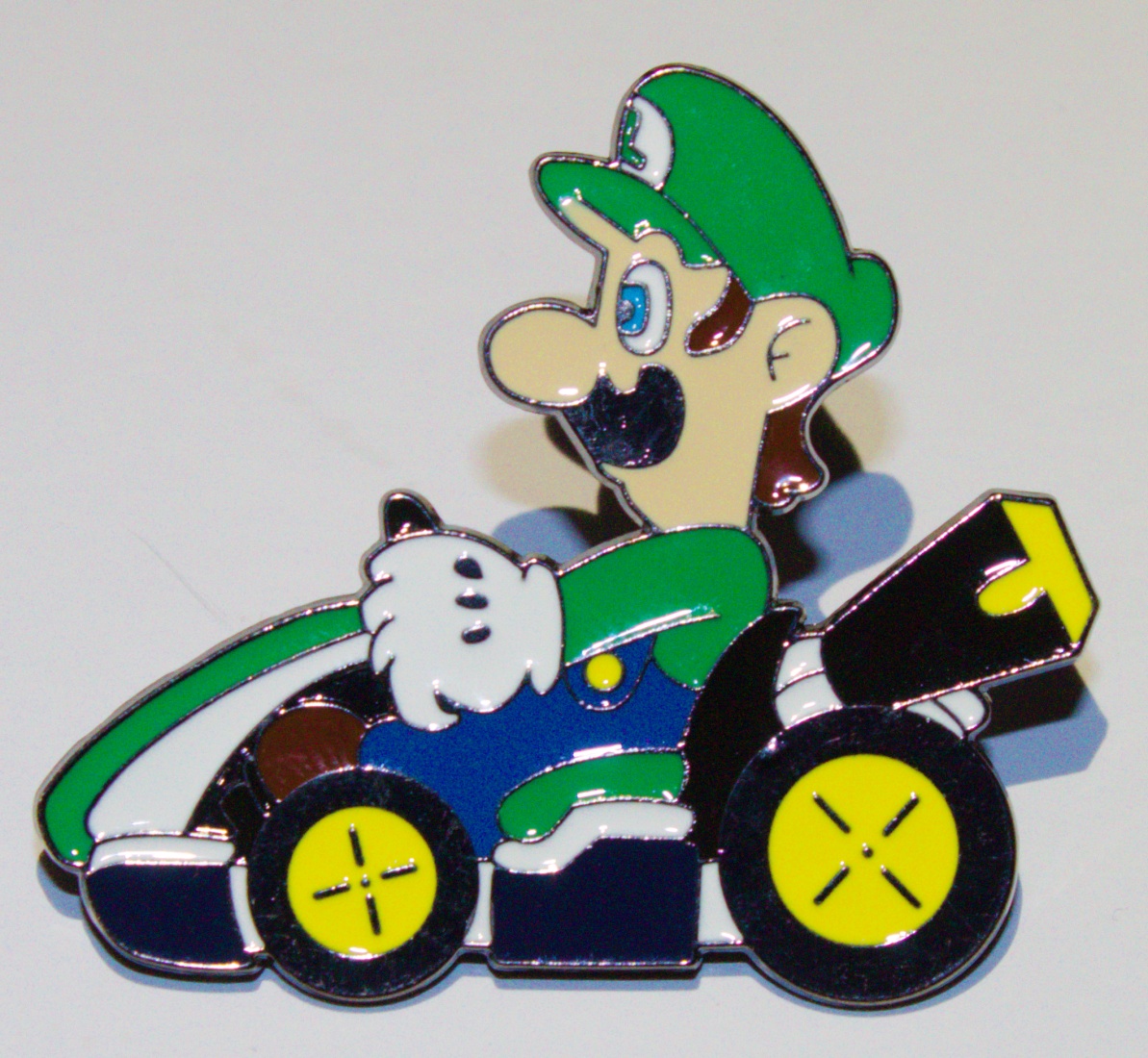 This is a 2″ wide x 1.75″ high metal enamel pin of the figure of Luigi, Mario’s brother from the popular Mario Kart video racing games. New and unused this is stored in a smoke and pet free environment.