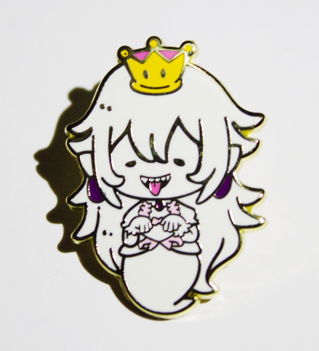This is a .875″ wide x 1.25″ high metal enamel pin of the ghost figure of Boosette or Booette, the fan created evil “Princess” mashup between King Boo and Peach from the popular video game Super Mario Bros. Not an official canon character, but not denied by Nintendo either. This is new and unused and is stored in a smoke and pet free environment.
