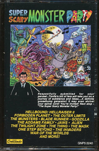 Produced in 1994, this mint, original shrinkwrap, never played music cassette contains a collection of sci-fi and horror music from such films and TV shows as Hellbound: Hellraiser II, Forbidden Planet, The Outer Limits, The Munsters, Blade Runner, Godzilla, The Addams Family, Jaws, Alien, The Twilight Zone, The Thing, The Invaders, War of the Worlds and many more.