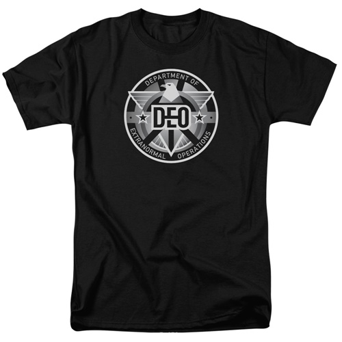 This is a black t-shirt featuring the name and logo image of the DEO (Department of Extranormal Operations) from the hit TV show, Supergirl. It is available in sizes Small, Medium, Large, X-Large, and 2X-Large. This is a new, unworn t-shirt that is stored in a smoke and pet free environment.
