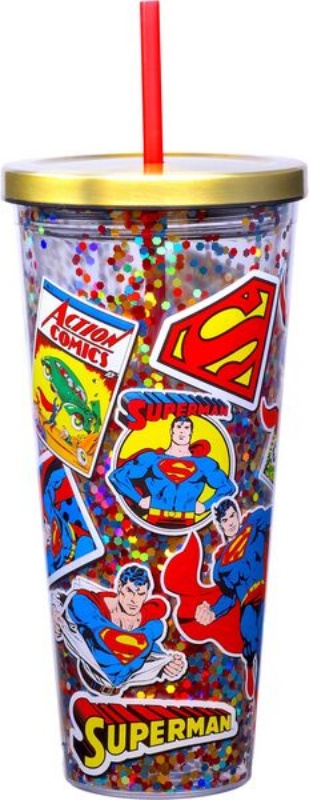 This is a 32 ounce clear glitter travel cup with a straw featuring the Superman logo and multiple images of Superman thru the years. It comes in a protective box and is a new, unused cup stored in a smoke and pet free environment.
