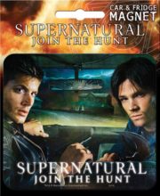 Produced by ATA BOY in 2015, this is set of four 1.25″ wide round buttons that features images and logos from the hit TV series Supernatural. This is a new, never used, button set attached to a display card stored in a smoke and pet free environment.