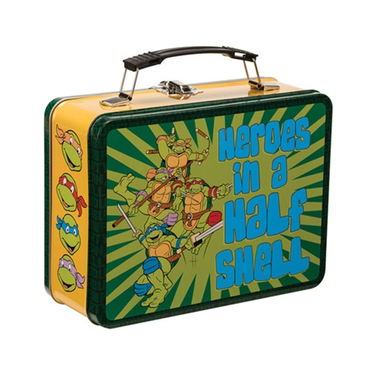 Produced in 2014, this is a 9″ long x 3.5″ wide x 7.5″ tall metal carry all tin tote or lunchbox featuring comic art images of the Teenage Mutant Ninja Turtles. The front is embossed and the reverse has the phrase “Heroes in a half shell”. It is a new, unused tin tote/lunchbox stored in a smoke and pet free environment.