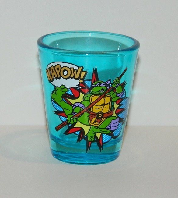 This is a new, never used, 2 ounce blue/green tinted shot glass featuring the fighting image of Donatello saying KAPOW! from the animated Teenage Mutant Ninja Turtles. This is stored in a smoke and pet free environment.