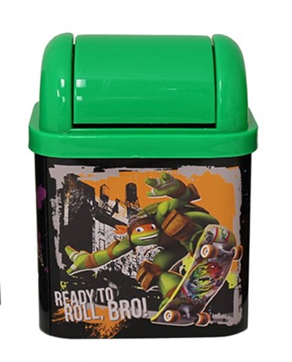 Produced in 2015, this is a 3.5″ long x 4.5″ wide x 6″ tall metal and plastic (the lid) Flip Lid Desktop Tins or mini trashcans featuring comic art images of the Teenage Mutant Ninja Turtles. It is new, unused tins and is stored in a smoke and pet free environment.