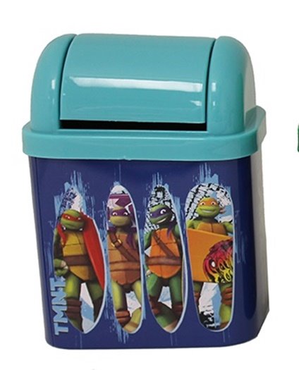 Produced in 2015, this is a 3.5″ long x 4.5″ wide x 6″ tall metal and plastic (the lid) Flip Lid Desktop Tins or mini trashcans featuring comic art images of the Teenage Mutant Ninja Turtles. It is new, unused tins and is stored in a smoke and pet free environment.