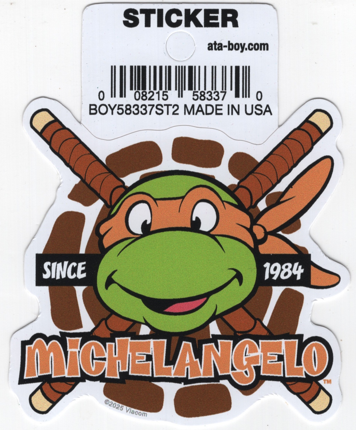 This is a 3″ diameter (approximate) sticker decal that features Michelangelo’s face over Nunchucks from the Teenage Mutant Ninja Turtles animated TV series. This is a new, unused sticker with an easy front peel off removal that is stored in a smoke and pet free environment.