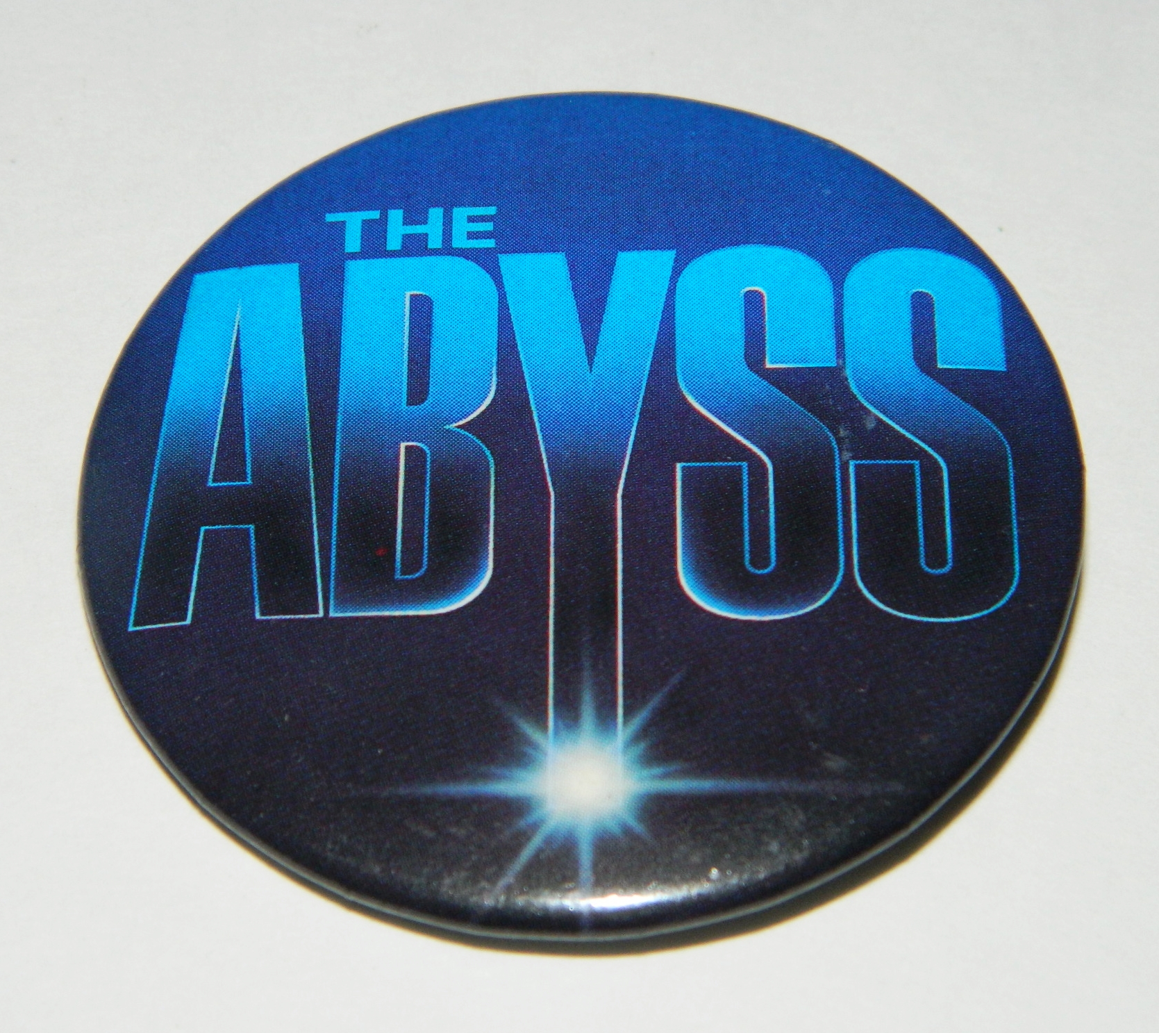 This is a licensed button produced in 1989 to promote the release of the hit The Abyss direct by James Cameron. It features the name logo over the dark blue sea. It is a new, unused button, measuring 2.25″ wide, with only minor dings from years in storage in a smoke and pet free environment.