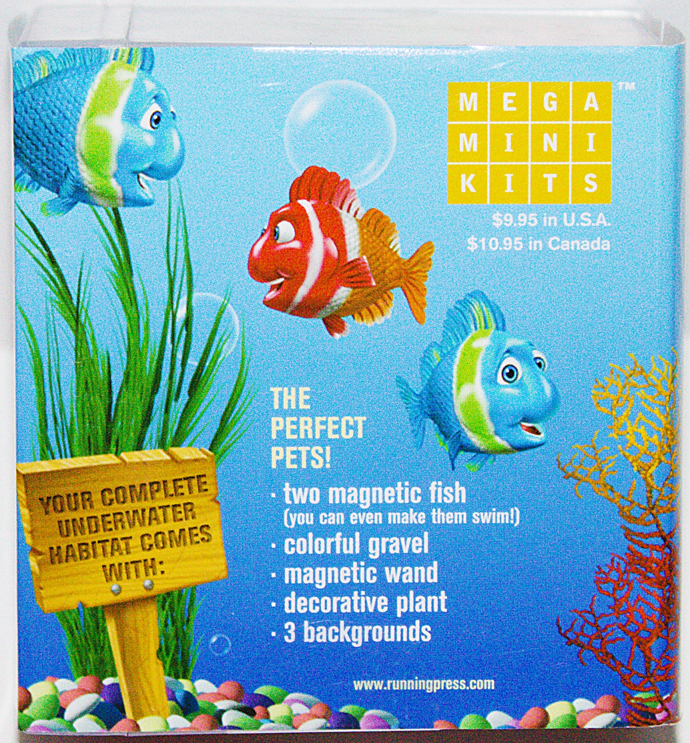 They don’t require allergy shots, expensive pet sitters, or diamond-studded collars. Desktop fish are the perfect pets and will always be there to entertain you, even if you forget to feed them for months on end! Following on the heels of underwater mania following Finding Nemo and Shark Tales, and the popularity of virtual pets, this desktop aquarium will be a fun addition to the workplace. It also makes a great gift for animal lovers. Kit includes two magnetic fish, magnetic wand to make fish swim, plant, gravel, 4 playful backgrounds, and 32-page booklet. This is a new, sealed copy that we purchased direct from the publisher and it has been stored in a smoke and pet free environment.