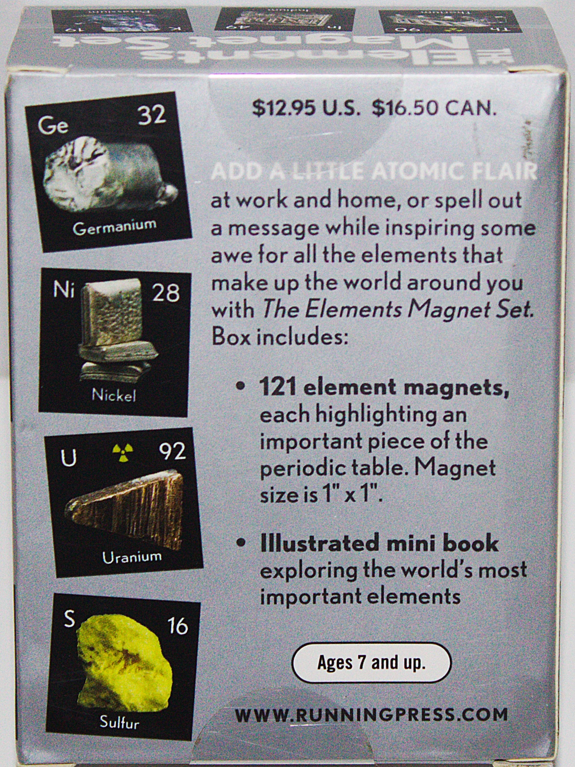 Display and play with the building blocks of life with The Elements Magnet Set! Based on the iconic images from Theodore Gray’s bestselling book The Elements, this beautiful magnet set is the perfect way to add a little atomic flair at work and home. Spell out a fun message or just display and inspire some awe for all the elements that make up the world around you. This miniature kit includes: 121 element magnets, each highlighting an important piece of the periodic table. Magnet size is approximately 1″ x 1″. And a 48-page book exploring the world’s most important elements, with full color-photographs throughout. This is a new, sealed copy that we purchased direct from the publisher and it has been stored in a smoke and pet free environment.