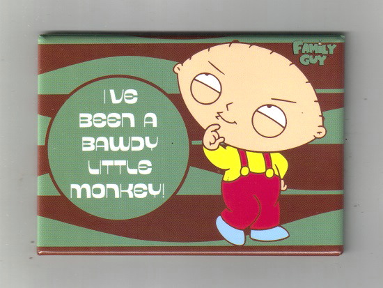 Produced in 2008, this is a licensed, large 2 1/2″ x 3 1/2″ magnet featuring the figure of Stewie saying “I’ve Been A Bawdy Little Monkey!” from the hit animated TV series The Family Guy. This is a new, unused magnet. It has been stored in a smoke and pet free environment.