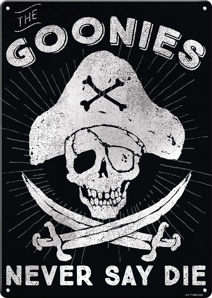 This is an 11.5″ x 8.25″ heavy grade metal sign poster featuring images and phrases from the 1985 cult movie The Goonies. These are produced in the style of the original metal signs that were common in the first half of the 20th century. It is a new, never used sign, complete with pin holes in the corners for easy hanging as well as a plastic tab on the top back side and protected in shrink wrap. These also look very nice framed. It has been stored in a smoke and pet free environment.