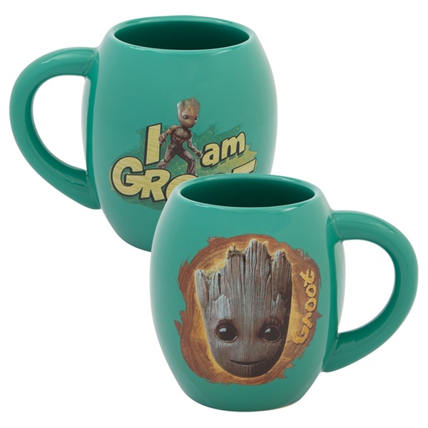 This is a teal green ceramic 18 ounce oval coffee mug featuring the image of the face of the baby Groot on the front and his figure above the words I Am Groot on the back from Marvel Comics Guardians of the Galaxy movie Vol.2. This mug is new and unused with a photo quality design, is microwave and dishwasher safe and is stored in a smoke and pet free environment.