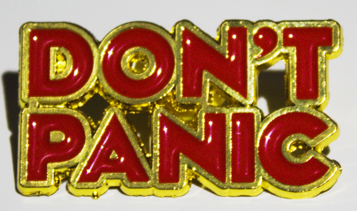 This metal enamel pin features the famous Don’t Panic logo from the popular book, movie and TV series The Hitchhikers Guide To The Galaxy. This new, unused, pin measures 1.375″ wide and .5″ high with gold toned trim and it is stored in a smoke and pet free environment.