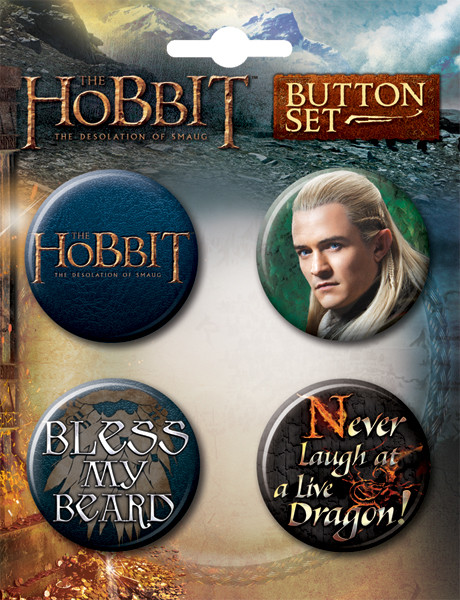 Produced by ATA BOY in 2014, this is set of four 1 1/4″ wide round buttons that features characters, logos and quotes from the hit movie The Hobbit: The Desolation of Smaug. This is a new, never used, button set attached to a display card. It has been stored in a smoke and pet free environment.