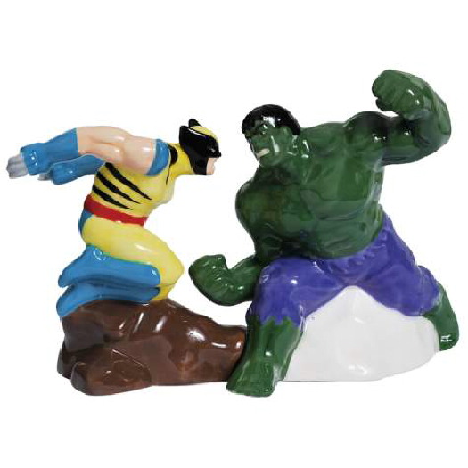 This is a 4.5″ tall set of ceramic salt and pepper shakers in the image of Marvel Comics super heroes The Incredible Hulk and Wolverine fighting each other. It is new and unused, held together by imbedded magnets and ships in an illustrated box. It has been stored in a smoke and pet free environment.
