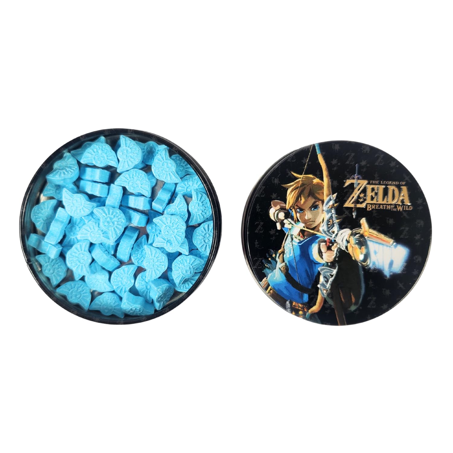 Nintendo’s Legend of Zelda’s Hyrule Kingdom is secure, the triforce is protected. This tin is filled with 1.2 ounces of sour blue raspberry flavored candy. This is a new, never opened sealed box of 12 tins of candy stored in a smoke and pet free environment.