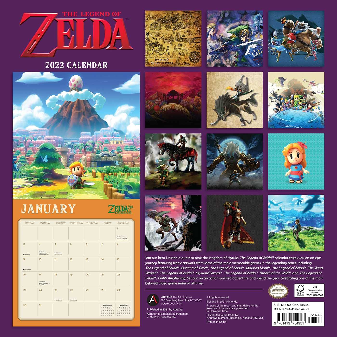 Set off on an action-packed adventure with our hero Link as he embarks on a series of quests to save the kingdom of Hyrule in this exciting 12-month calendar. The Legend of Zelda calendar takes you on an epic journey through 2022, full of colorful, iconic artwork from several games in Nintendo’s legendary series, including The Legend of Zelda: Ocarina of Time, The Legend of Zelda: Majora’s Mask, The Legend of Zelda: The Wind Waker, The Legend of Zelda: Skyward Sword, and The Legend of Zelda: Breath of the Wild. This is a mint, unused, original shrink wrap copy, printed by Universe Publishing and stored in a smoke and pet free environment. The photo is for identification only but you will receive one as described.