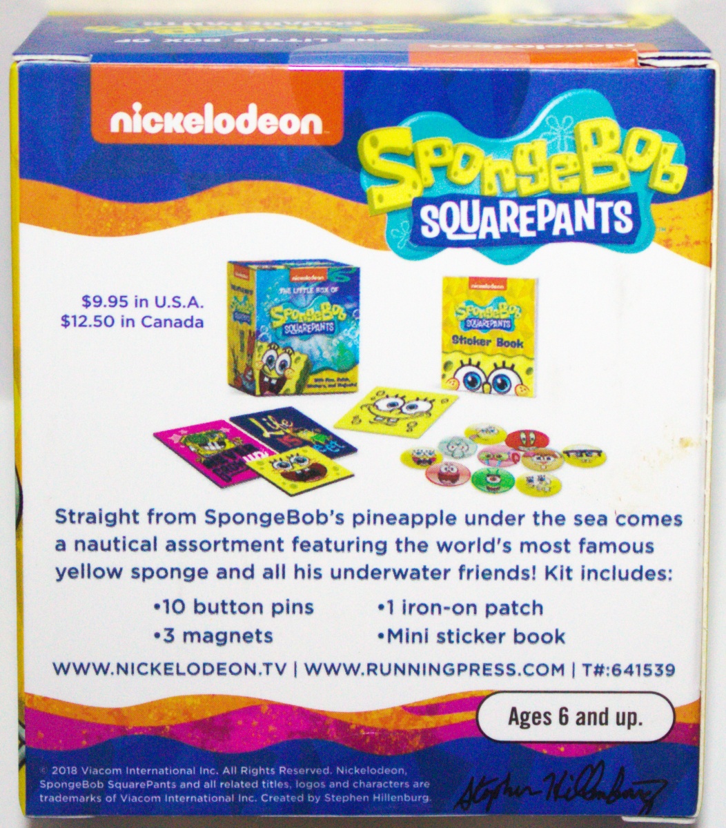 Straight from that pineapple under the sea comes a nautical assortment of pins, patches, magnets, and stickers, featuring the world’s most famous yellow sponge and all his underwater friends! This boxed set includes: 10 button pins, 1 iron-on patch, 3 magnets and a 16-page sticker book. This is a new, sealed copy that we purchased direct from the publisher and it has been stored in a smoke and pet free environment.