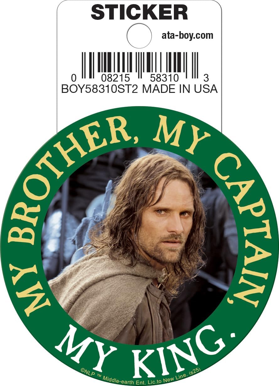 This is a 3″ wide (approximate) sticker decal that features a photo image of Aragorn surrounded by the words “My Brother, My Captain, My King” from the hit movie trilogy The Lord of the Rings. This is a new, unused sticker with an easy front peel off removal that is stored in a smoke and pet free environment.
