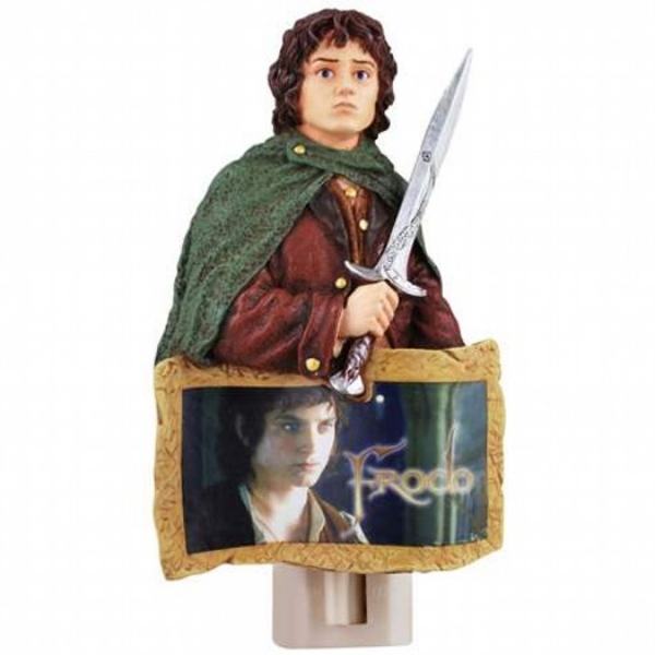 This is a 4.25″ high night light that features a ceramic figure in the image of Frodo from the hit movie trilogy The Lord of the Rings. The base has a photo image of him in a scene from the movies. It is UL approved with an easy on and off switch. It is new and unused, sealed in an illustrated box.