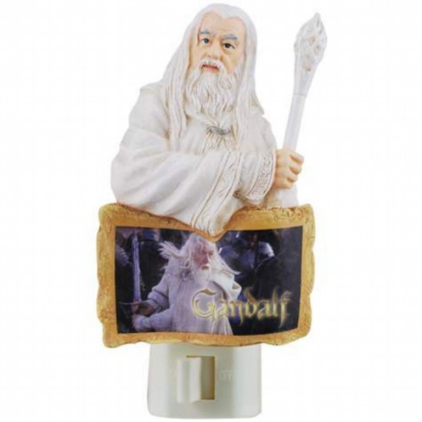 This is a 4.25″ high night light that features a ceramic figure in the image of Gandalf from the hit movie trilogy The Lord of the Rings. The base has a photo image of him in a scene from the movies. It is UL approved with an easy on and off switch. It is new and unused, sealed in an illustrated box and stored in a smoke and pet free environment.