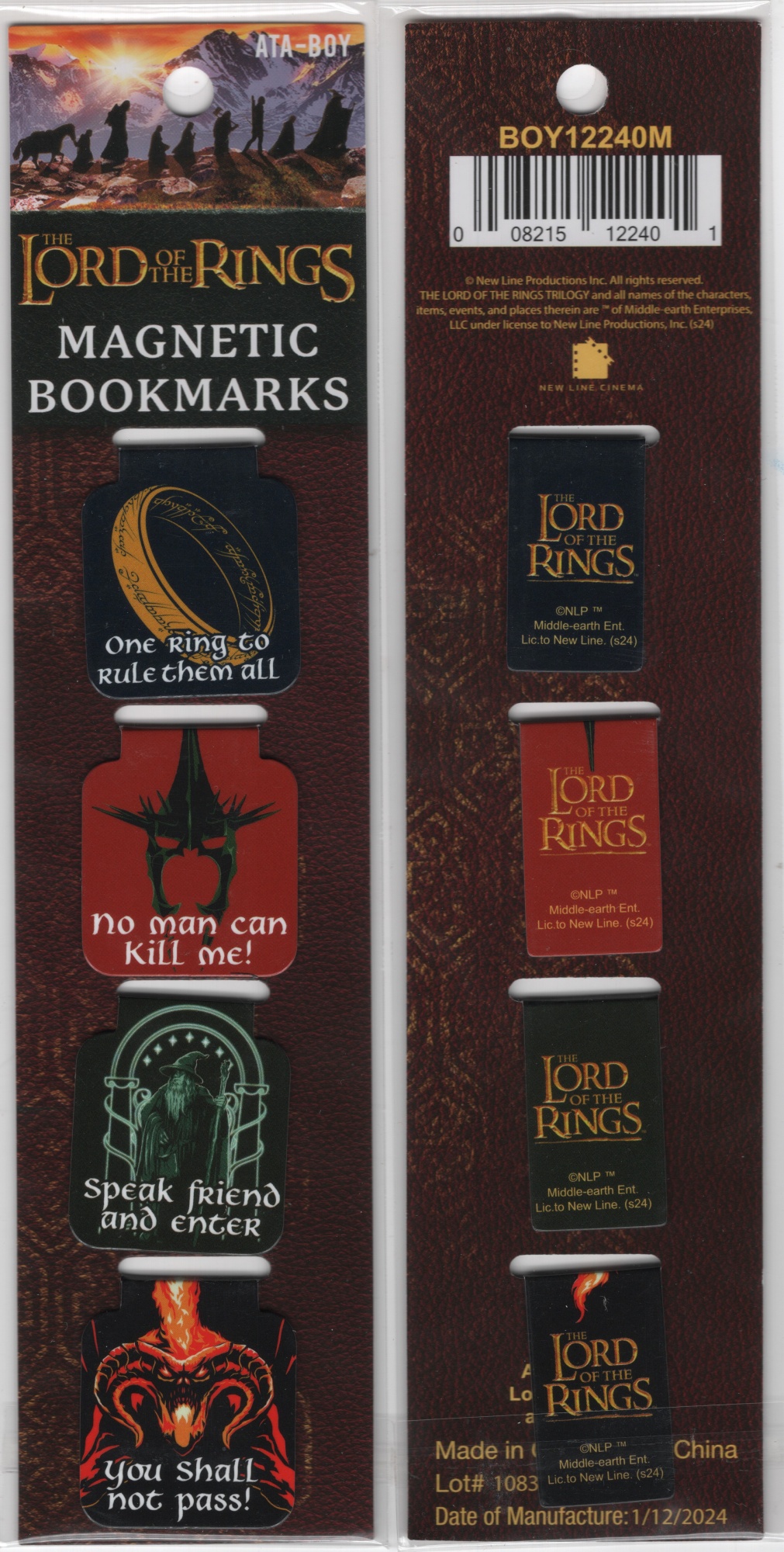 This is a licensed set of four different 1.25″ x 1.375″ magnetic bookmarks featuring images and phrases from the cult movie series The Lord of the Rings. This is a new, unused magnet set sealed in its original package and stored in a smoke and pet free environment.