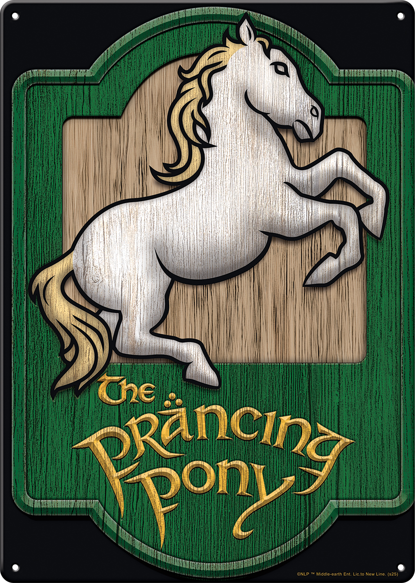 This is an 11.5″ x 8.25″ heavy grade metal sign poster that features a reproduction of The Prancing Pony Pub Sign, the place where Frodo meets Aragorn in the Lord of the Rings movies. These are produced in the style of the original metal signs that were common in the first half of the 20th century. It is a new, never used sign, complete with pin holes in the corners for easy hanging as well as a plastic tab on the top back side and protected in shrink wrap. These also look very nice framed. It has been stored in a smoke and pet free environment.
