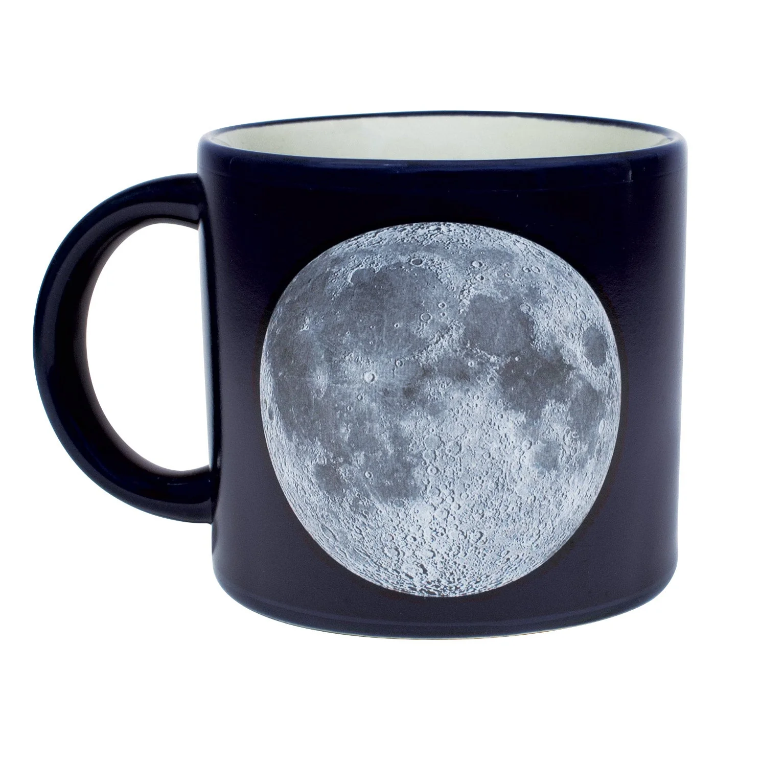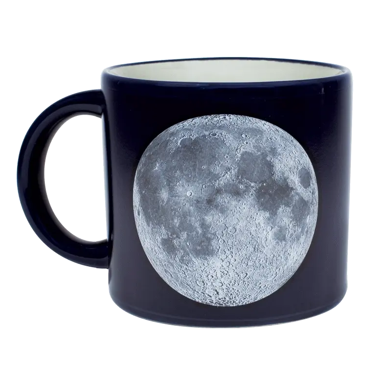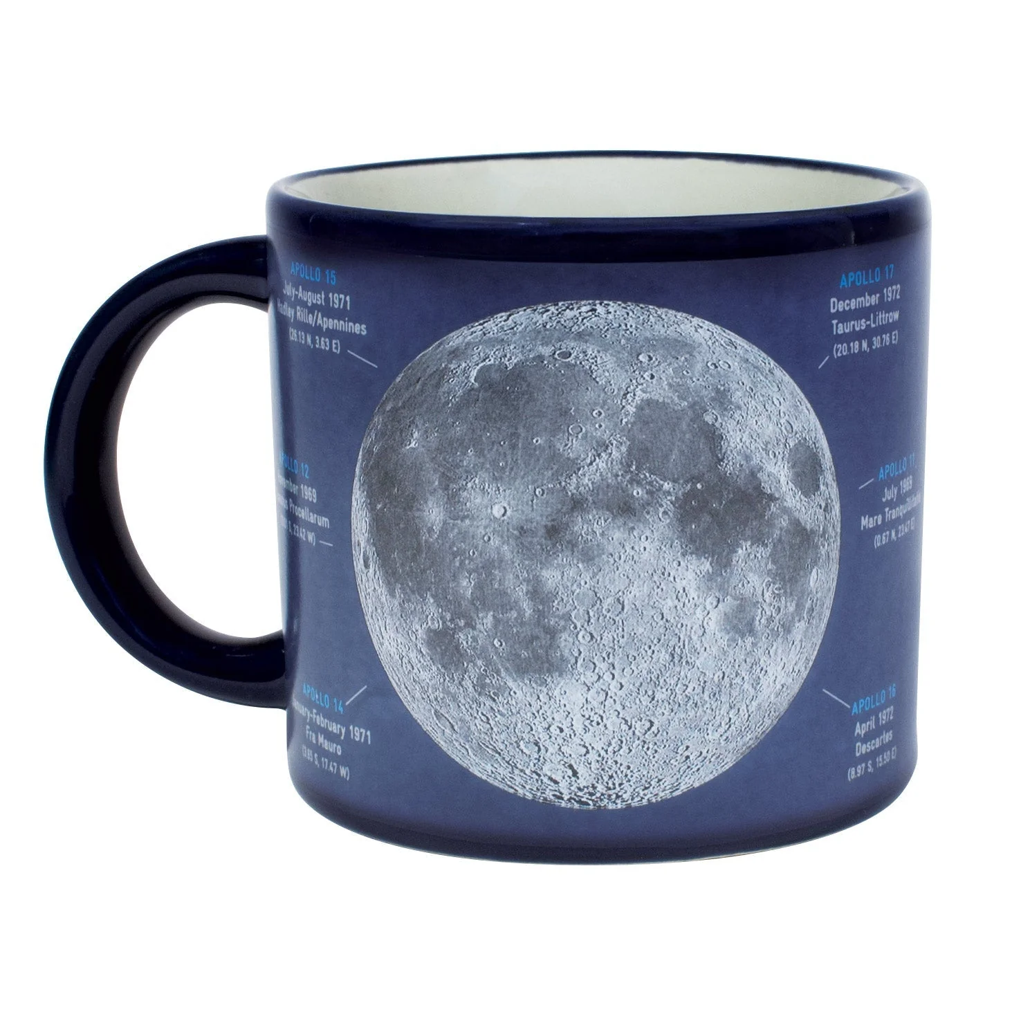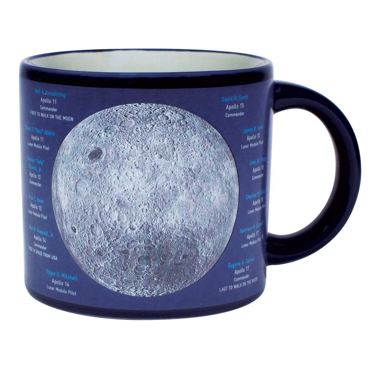 Here are two gorgeous Moon portraits – the “magnificent desolation” of the Near Side and the mysterious terrain of Far Side. When the mug is cold, you see the Moon(s) against a sea of black. Add a steaming beverage and watch the mug transform, revealing the names of Apollo missions, astronauts, landing sites, and milestones. “We leave as we came and, God willing, as we shall return, with peace, and hope for all mankind.” It is new and unused, comes in its own illustrated gift box and is stored in a smoke and pet free environment.