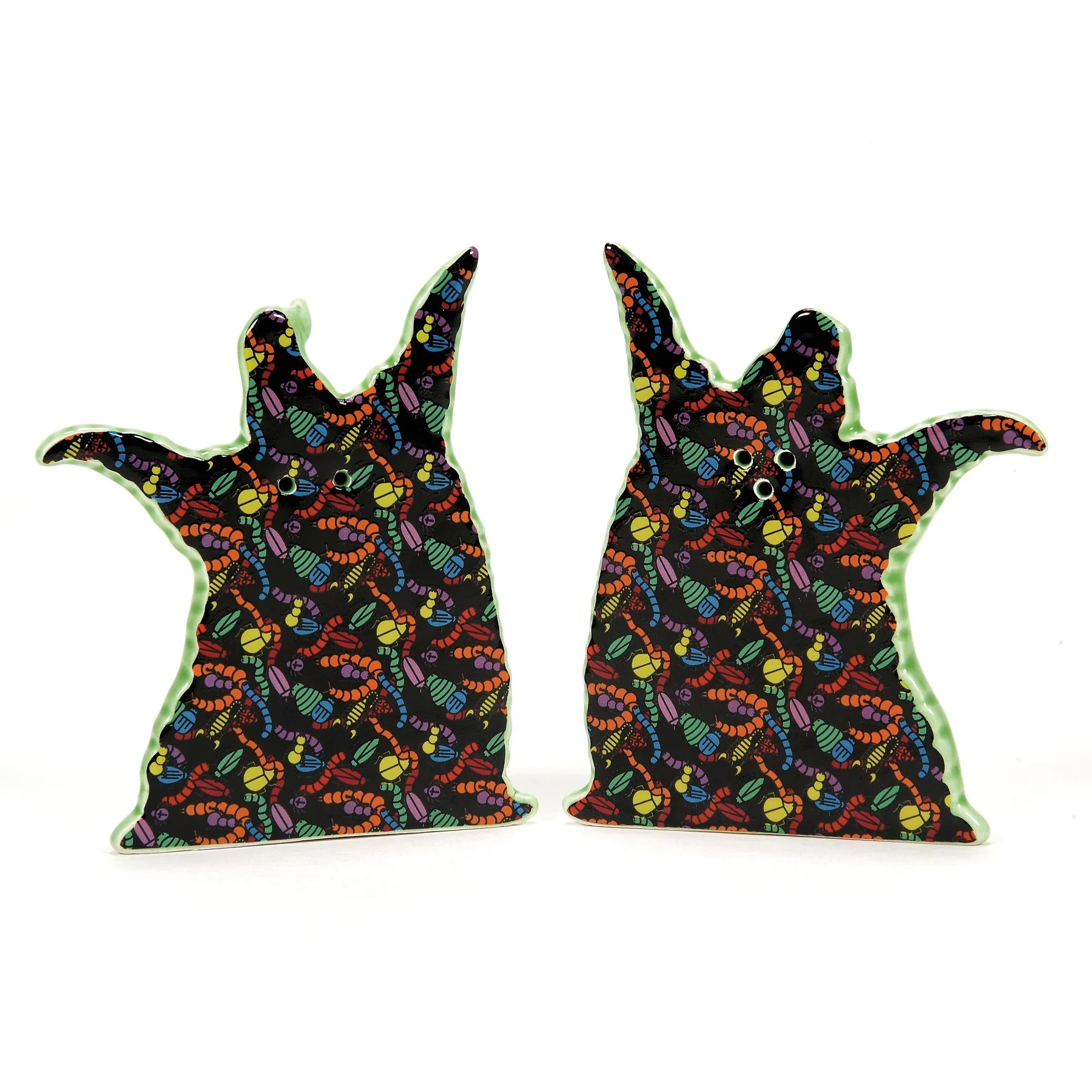 This is a 3.75″ tall x 1.06″ thick x 2.95″ wide set of ceramic salt and pepper shakers in the image of Oogie Boogie standing from Walt Disney’s The Nightmare Before Christmas animated movie. Discover Oogie Boogies salty and peppery sides with this 3 dimensional sculpted ceramic set. Split Oogie in half and see the worms and bugs that reside beneath his burlap textured skin. Add some hauntingly delicious flavor to your next meal with these salt and pepper shakers. Handcrafted and hand-painted to precision, the ceramic shakers are new and unused, ship in an illustrated box and are stored in a smoke and pet free environment.