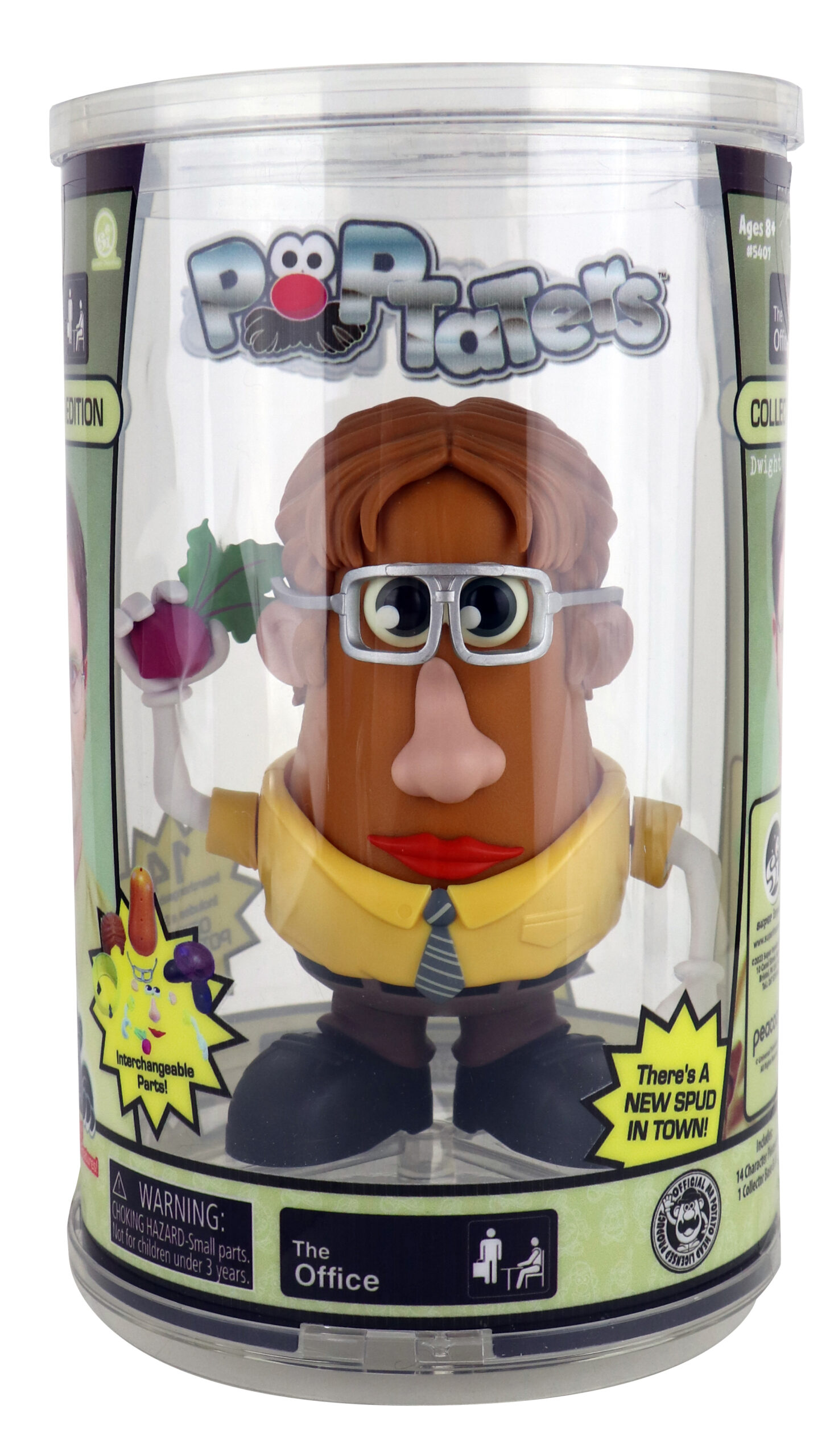 Produced by Super Impulse, this is part of their Poptaters lines of toys and features Dwight Schrute from the popular TV series The Office. Poptaters Dwight Schrute is the ultimate fan mashup combining the iconic Potato Head with pop culture icons, creating hilarious, fun collectibles! This includes 14 removable, interchangeable facial and body parts including one surprise Potato Head original piece! The 4″ body nearly doubles in size when accessories are on. Purchased new by us from the manufacturer, it is stored in a smoke and pet free environment.
