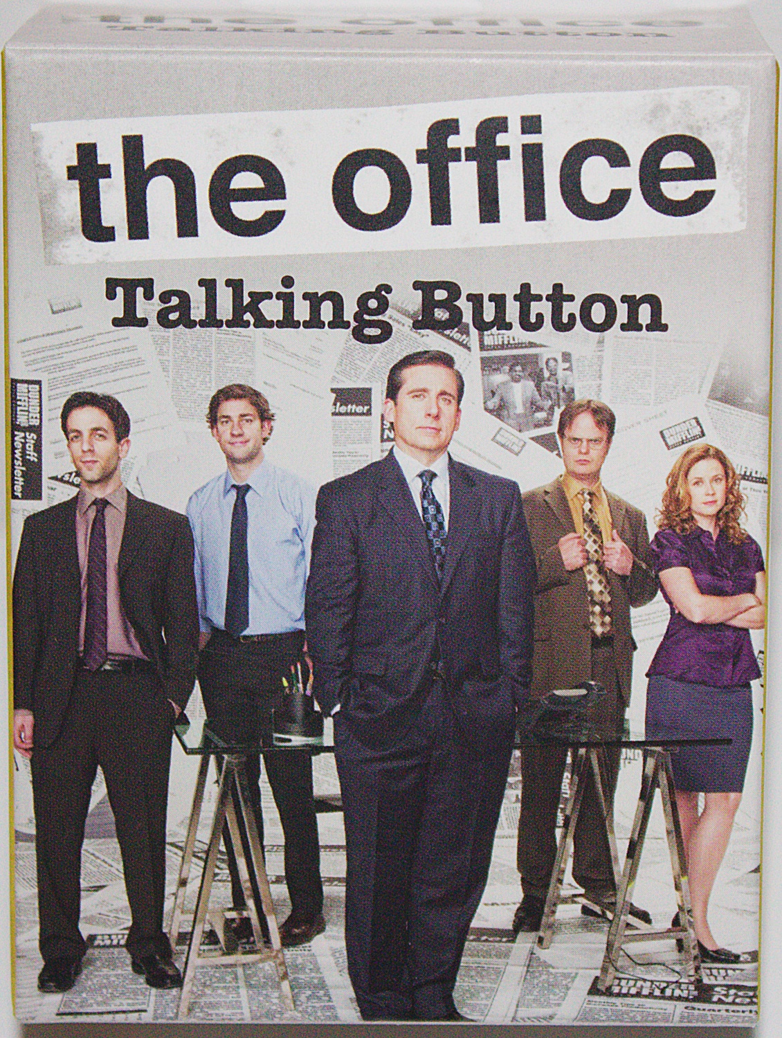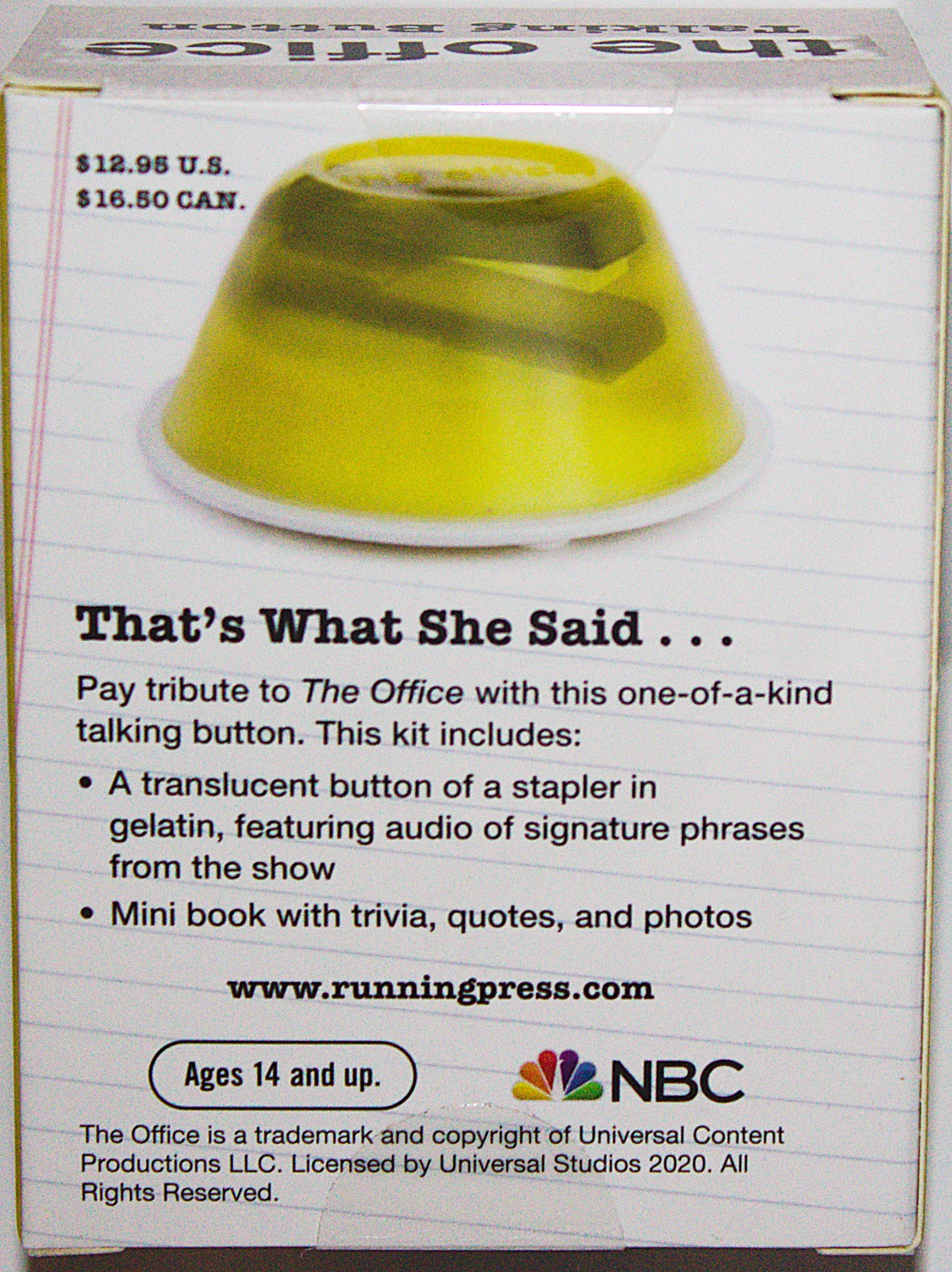 Pay tribute to the award-winning comedy series The Office with this one-of-a-kind talking button shaped like a stapler in gelatin that plays iconic phrases from Dunder Mifflin. It includes a translucent button of a stapler in gelatin, featuring immortal phrases from the show along with a 32-page book with trivia questions, fun quotes, and full-color photos throughout. This is a new, sealed copy that we purchased direct from the publisher and it has been stored in a smoke and pet free environment.