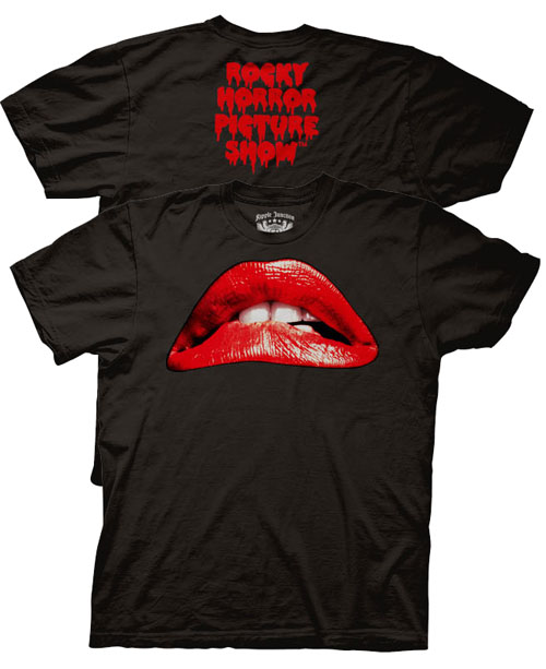 This is a black adult mens style t-shirt, featuring the large red lips logo from the hit cult film, The Rocky Horror Picture Show on the front and the bleeding movie title logo on the back. This is a new, never worn t-shirt. It has been stored in a smoke and pet free environment.