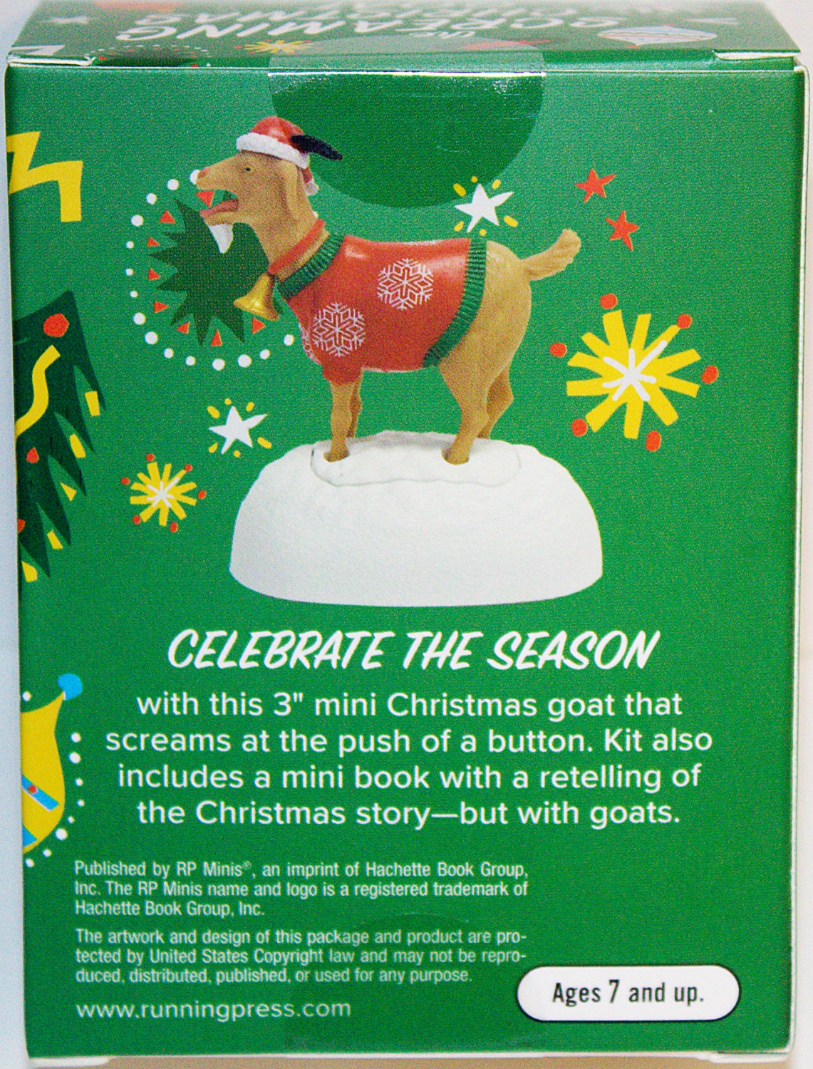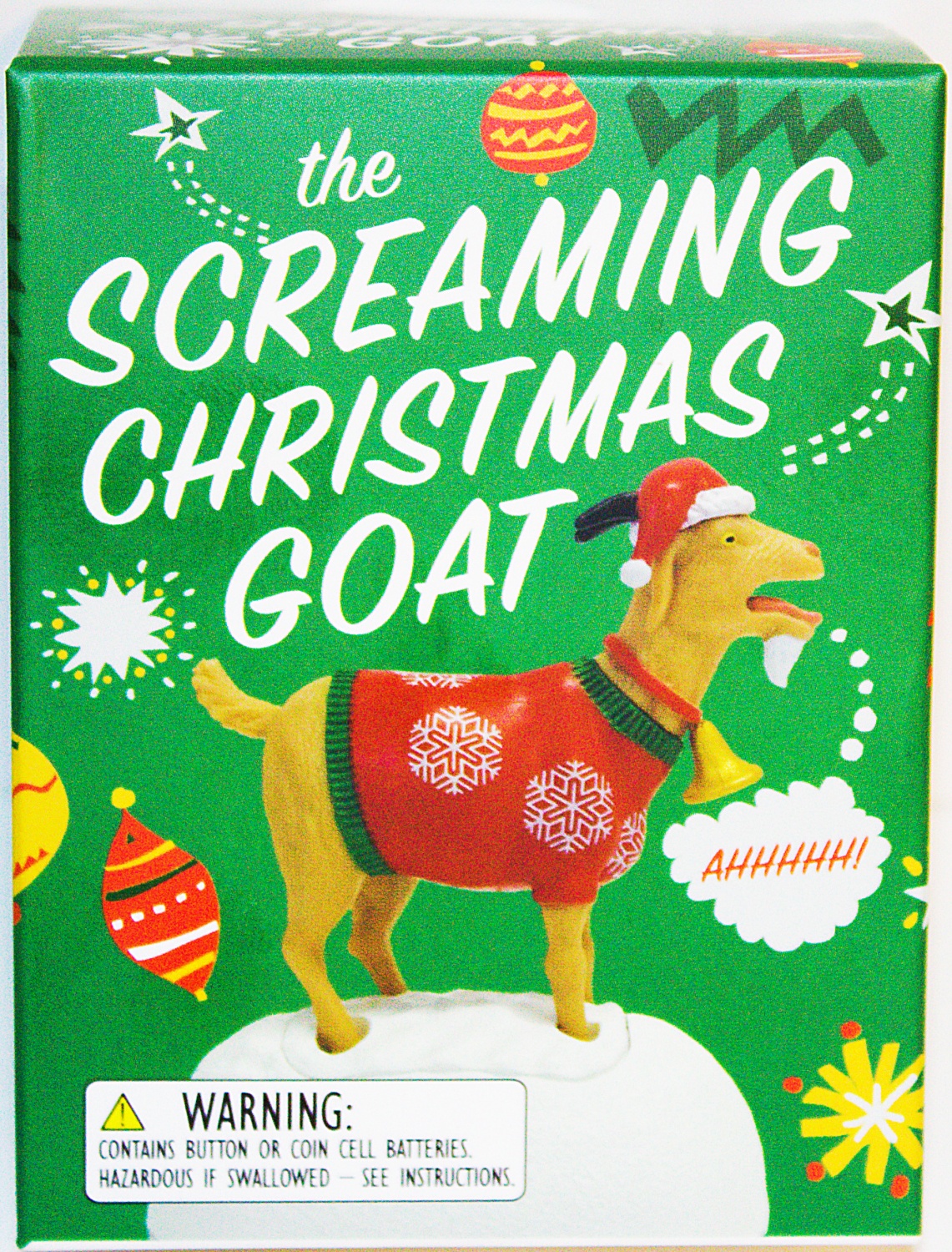 He’s baaaaack! This very merry Christmas version of the wildly popular original screaming goat is perfect as a gag gift at office holiday parties, gifting to your friends, or adding some festive flair and humor to your holiday season. It includes a 3″ mini Christmas screaming goat figurine decked out in an ugly holiday sweater, Santa hat, and jingle bell collar. The Christmas goat’s incredibly lifelike and signature scream plays when the snow mound base is pressed. The kit also includes a mini book featuring the nativity story told with goats, gift ideas for your goat, and full-color illustrations This is a new, sealed copy that we purchased direct from the publisher and it has been stored in a smoke and pet free environment.