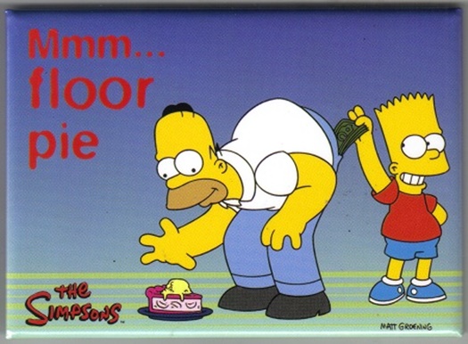 Produced in 2011, this is a licensed, large 2 1/2″ x 3 1/2″ magnet featuring Homer and Bart from the animated series The Simpsons. Homer is bending over and saying “Mmm… floor pie”. This is a new, unused magnet stored in a smoke and pet free environment.