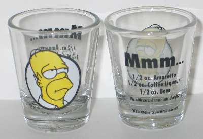 This is an illustrated clear shotglass featuring the face of Homer from the Simpsons TV series on one side and a drink recipe on the other. This is a mint, unused shot no longer being made stored in a smoke and pet free environment.