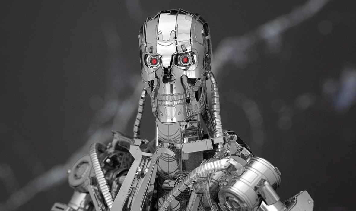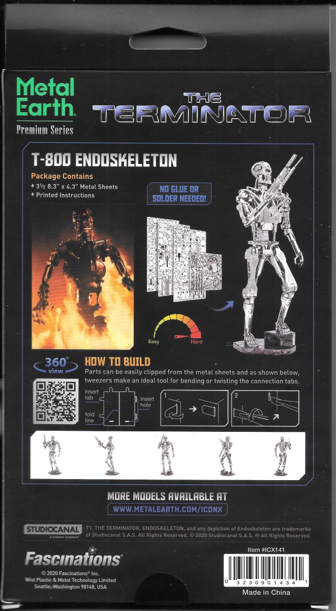 This amazingly detailed model starts as three and 1/2 8.3″ x 4.3″ metal sheets and finishes as a 3-D model. Build your very own Metal Earth® Premium Series model of a T-800 Terminator showing its endoskeleton. Each Premium Series kit is made from high quality steel sheets and features amazing detail. Easy to follow instructions are included in each kit and no glue or solder required! Simply snip out the pieces and bend the tabs through corresponding connection points. It is approximately 2.68″ long by 4.33″ wide by 7.68″ high when assembled and is an expert level of difficulty and will take 60 minutes or more to complete. The sheets contain detailed laser etching for easy removal. Complete instructions are included to show you how to pop out the pieces, bend the tabs, and connect them at the attachment points. It has been stored in a smoke and pet free environment. We also offer an optional LED base or a Solar Spinner for better display of your model.