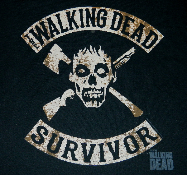 This is a black t-shirt, featuring a walker head with an axe and a shotgun behind in a skull and crossbones design surrounded by the words “Walking Dead Survivor” from the hit horror TV series The Walking Dead. This is a new, never worn shirt, available from us in size Large only for this listing. It has been stored in a smoke and pet free environment.