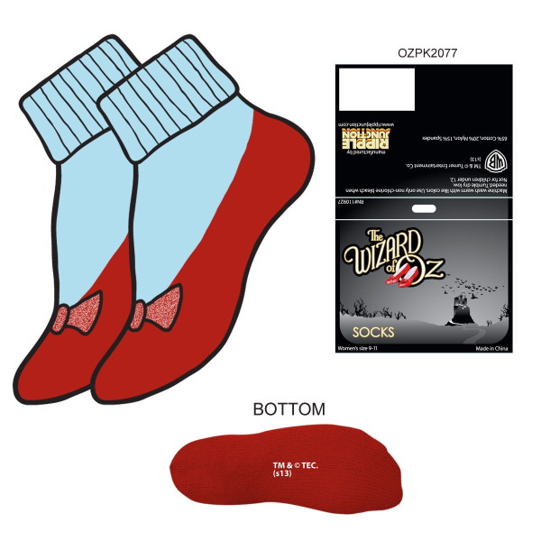 This is a new and unused pair of ankle socks featuring the Ruby Slippers that Dorothy wears from the popular movie The Wizard of Oz. These socks are for sizes 9-11 in Women’s and they are made of acrylic and polyester and are machine washable. They are stored in a smoke and pet free environment.