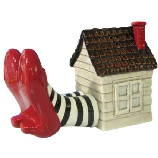 This is a 4″ tall set of ceramic salt and pepper shakers in the image of the Wicked Witch of the East with her legs sticking out from underneath the house that fell on her from the classic movie The Wizard of Oz. It is new and unused, stored in a smoke and pet free environment, and ships in an illustrated box. No longer made, it has embedded magnets to hold the two pieces together.