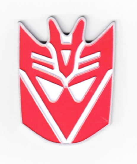 This is a 2.75″ high enamel metal badge, featuring the red and silver face logo of Decepticon from the TV series and movies Transformers. It has a peal off tab leaving a sticky back so this can be applied to any smooth surface. It is a new, unused badge stored in a smoke and pet free environment.