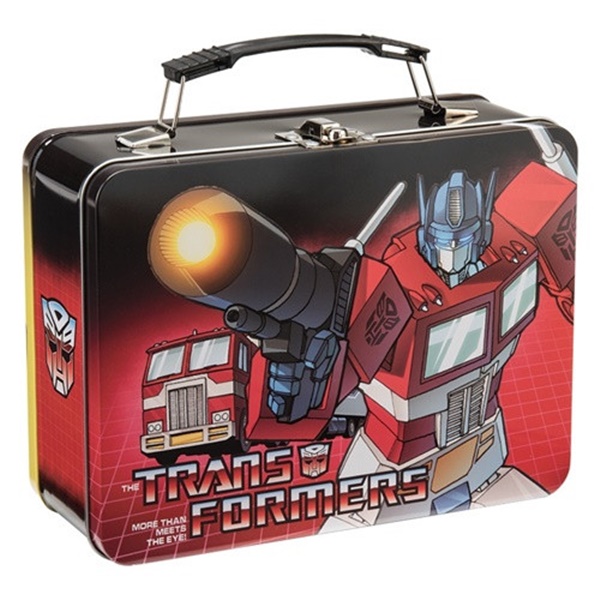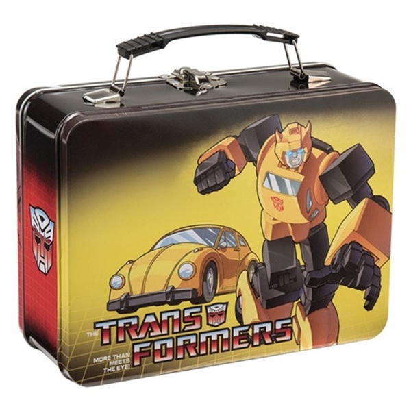 This is a 9″ long x 3.5″ wide x 7.5″ tall metal carry all tin tote or lunchbox featuring the art images of the Transformers characters Optimus Prime on one side and Bumblebee on the other. It has a collapsible plastic handle and a metal clasp closure. This is a new, unused tin tote/lunchbox no longer being produced, stored in a smoke and pet free environment.