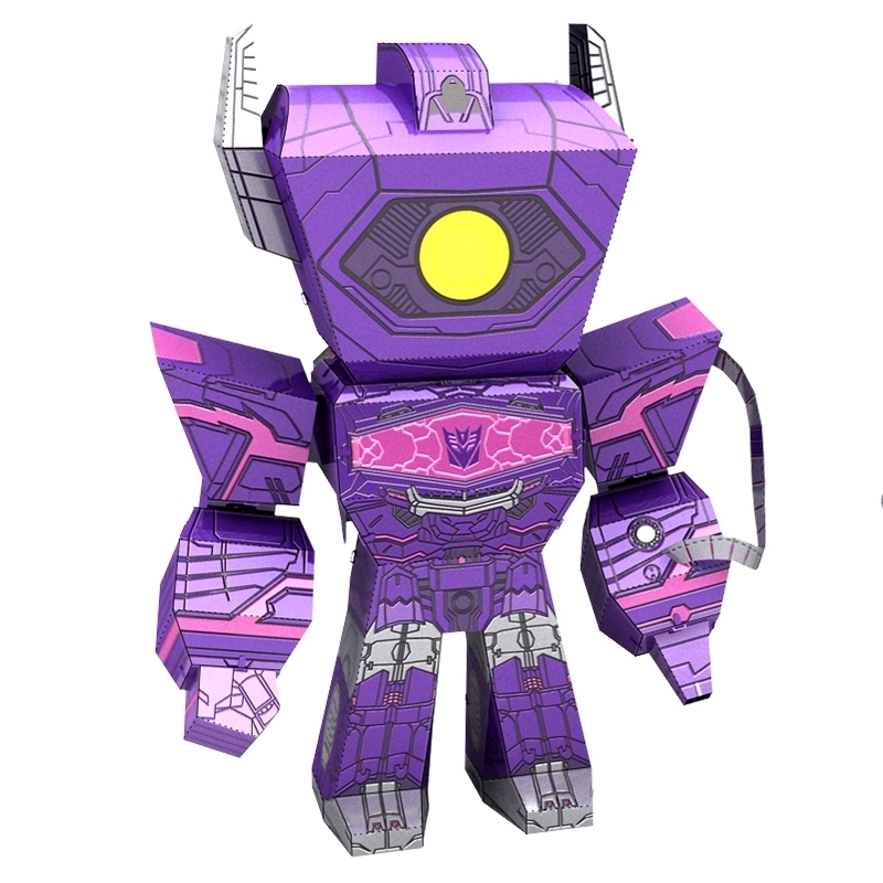 This amazingly detailed model starts as a 4″ square sheet and finishes as a 3-D Caricature model. It is approximately 2.75″ tall when assembled and this one features Shockwave from the popular cartoon, movie and comic series. The sheet contains detailed laser etching for easy removal. Complete instructions are included to show you how to pop out the pieces, bend the tabs, and connect them at the attachment points with an average assembly time of 30-45 minutes. It has been stored in a smoke and pet free environment. We also offer an optional LED base or a Solar Spinner for better display of your model.