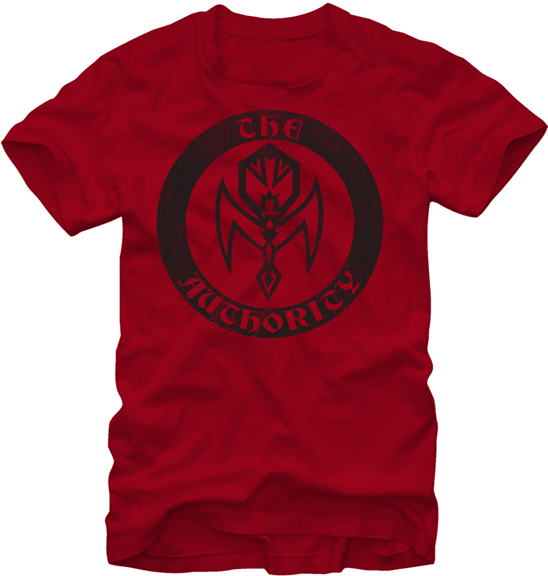 This is a cardinal red t-shirt bearing the logo of The Authority, the vampire council that controls the vampires activities worldwide from the hit cult HBO TV series True Blood. It is a new, unworn shirt that has been stored in a smoke and pet free environment.