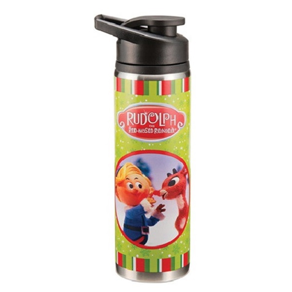 This is a 24 ounce wrap-around illustrated enamel coated stainless steel water bottle that features the art of Rudolph and his friends Hermey and the Snowman from the popular TV movie Rudolph the Red Nosed Reindeer. Featuring a new flip-top design, water bottles are eco-friendly, non-toxic, reusable and recyclable. It also has a hook at the top for attaching to back packs or belts. It is a new and unused bottle with limited holiday production..