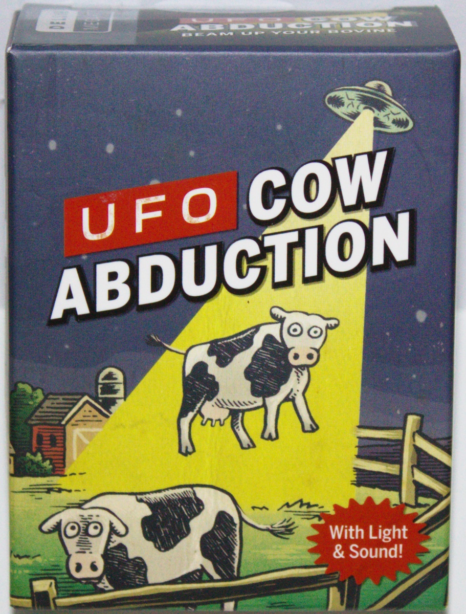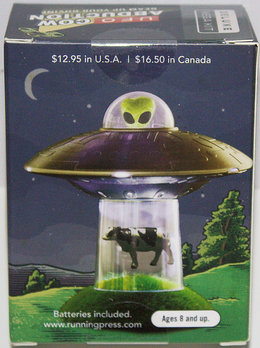 This out-of-this-world kit for sci-fi lovers is loaded with special effects! It includes: -3-inch diameter spaceship, equipped with a hinged cockpit dome from which a curious alien peers, and featuring multiple light and sound effects. By opening the cockpit dome and pressing the alien’s head, sound of spaceship engine plays, followed by eerie pre-abduction music. Six blue lights around the spaceship flash in rotation. Additionally, two bright LED lights beneath the ship glow, casting a beam of light in search of a specimen to abduct. When the spaceship is hovered in close proximity to the cow, a magnetically powered “abduction” occurs which simultaneously prompts new light and sound effects. Lights beneath the ship flash and music changes to a pulsating sound with intermittent cow mooing. When cow is abducted and alien head is pressed again, sound of the spaceship flying away plays, concluding your invasion and shutting off the spaceship. Miniature cow and faux grass mound -Transparent display stand to hover spaceship over cow when not invading the countryside -32-page book, The Cow Abduction Chronicles, featuring full-color illustrations This is a new, sealed copy from our files that we purchased directly from the publisher and it has been stored in a smoke and pet free environment.